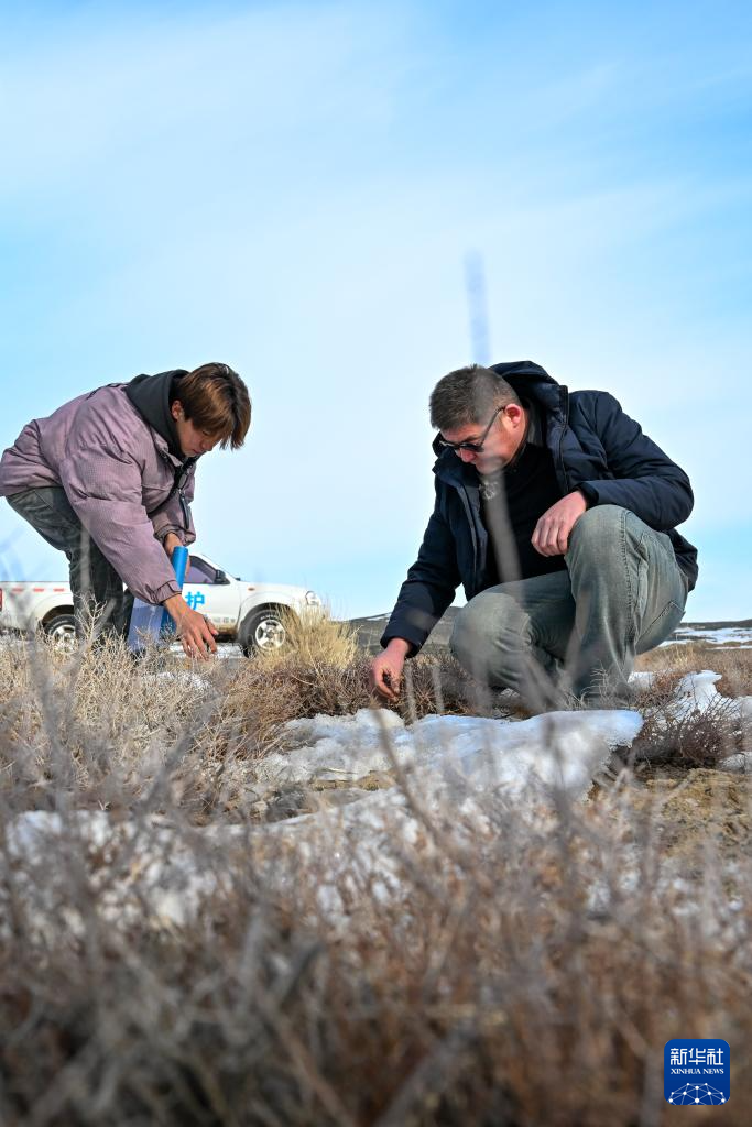 在新疆卡拉麦里山有蹄类野生动物自然保护区,乔木希拜普氏野马监测站的管护员在水源地回收红外相机(2月4日摄)。