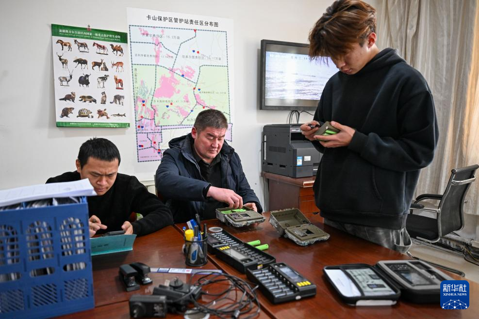 在新疆卡拉麦里山有蹄类野生动物自然保护区管理中心乔木希拜普氏野马监测站,管护员在更换红外相机电池和登记数据(2月4日摄)。
