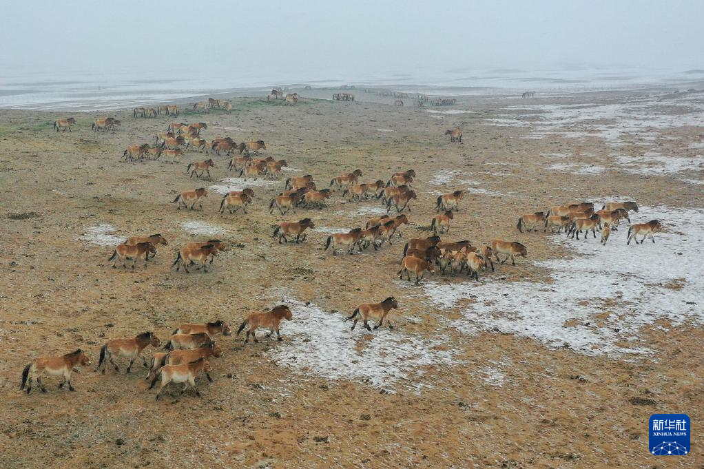 这是在新疆卡拉麦里山有蹄类野生动物自然保护区管理中心乔木希拜普氏野马监测站拍摄的野马(2月4日摄,无人机照片)。