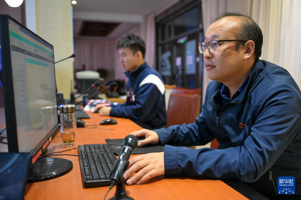 在新疆卡拉麦里山有蹄类野生动物自然保护区管理中心,科研人员在调度中心查看野马监测数据(2月5日摄)。