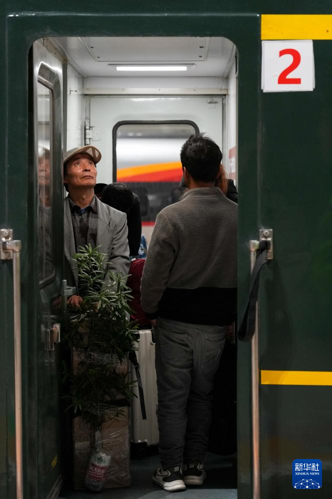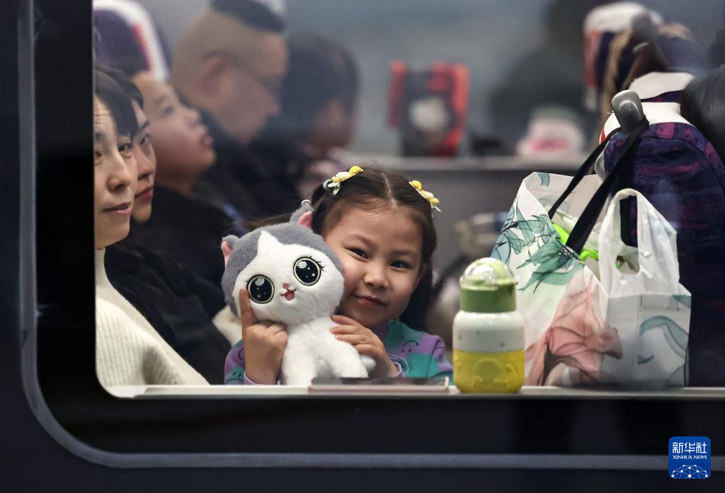 2月2日,搭乘2026年深圳地区春运首班车C7152次深圳北到岳阳东列车的乘客在车上照顾婴儿。
