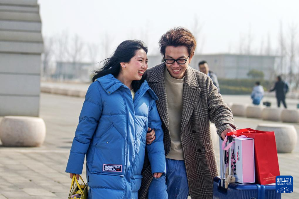 2月2日,在山东滕州站,旅客扛着行李出站。