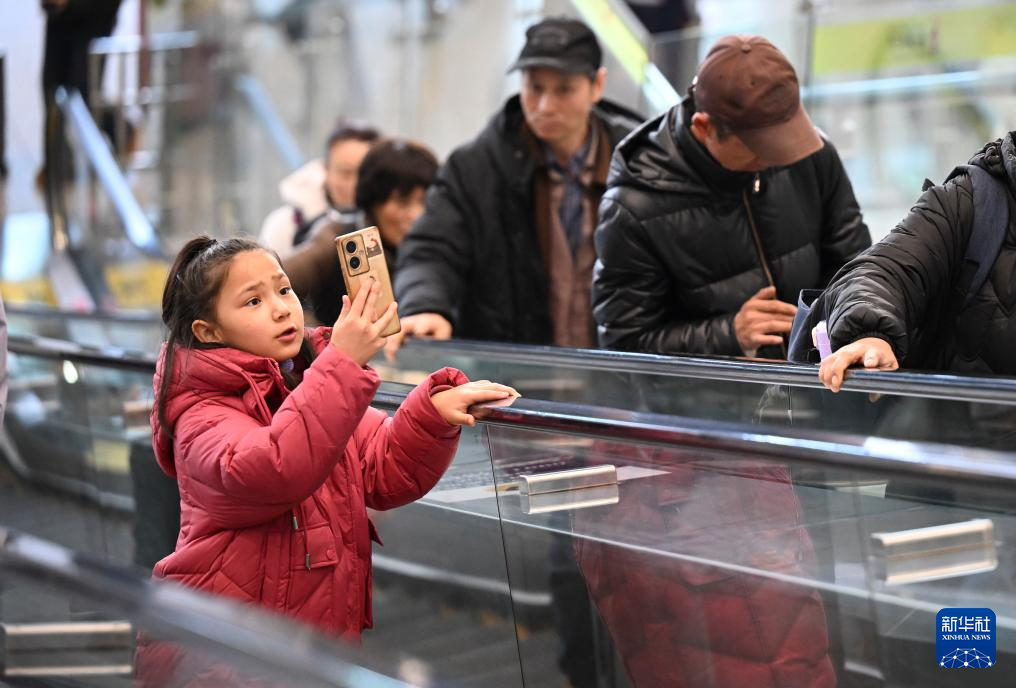 2月2日,旅客在兰州火车站候车厅拍照留念。