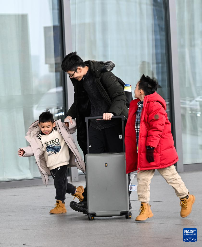 2月6日,在南京南站,小朋友跟随家人准备进站乘车。