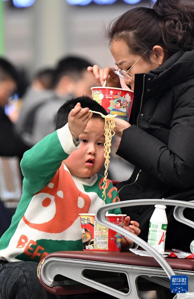 2月2日,旅客在西安北站候车大厅吃泡面。