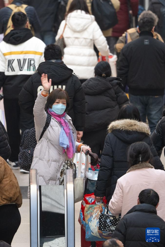 2月2日,在湖北武汉汉口火车站,旅客进站时挥手和送行的人告别。