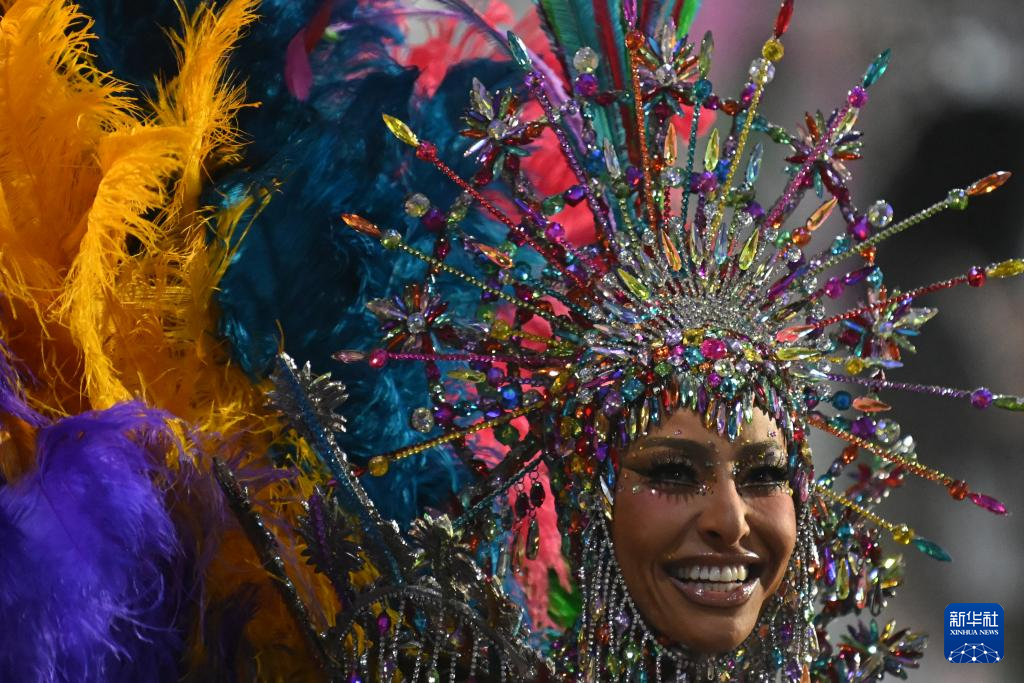 2月18日凌晨,桑巴舞者参加在巴西里约热内卢举行的2026年狂欢节游行。