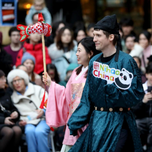 2月21日,川剧演员在英国伦敦卡姆登集市举行的中国春节庆典活动上与观众互动。