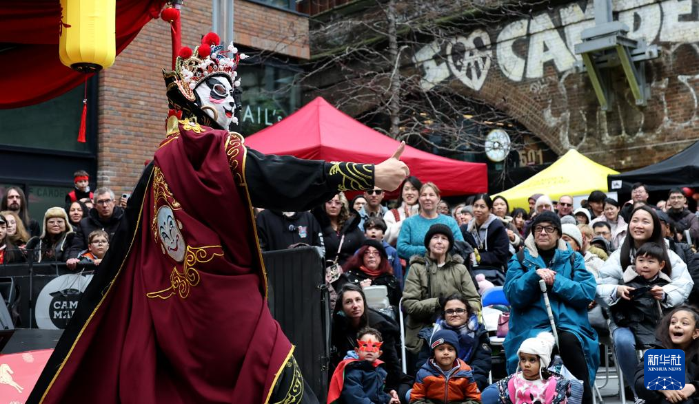 2月21日,人们在英国伦敦卡姆登集市举行的中国春节庆典活动上观看川剧变脸。