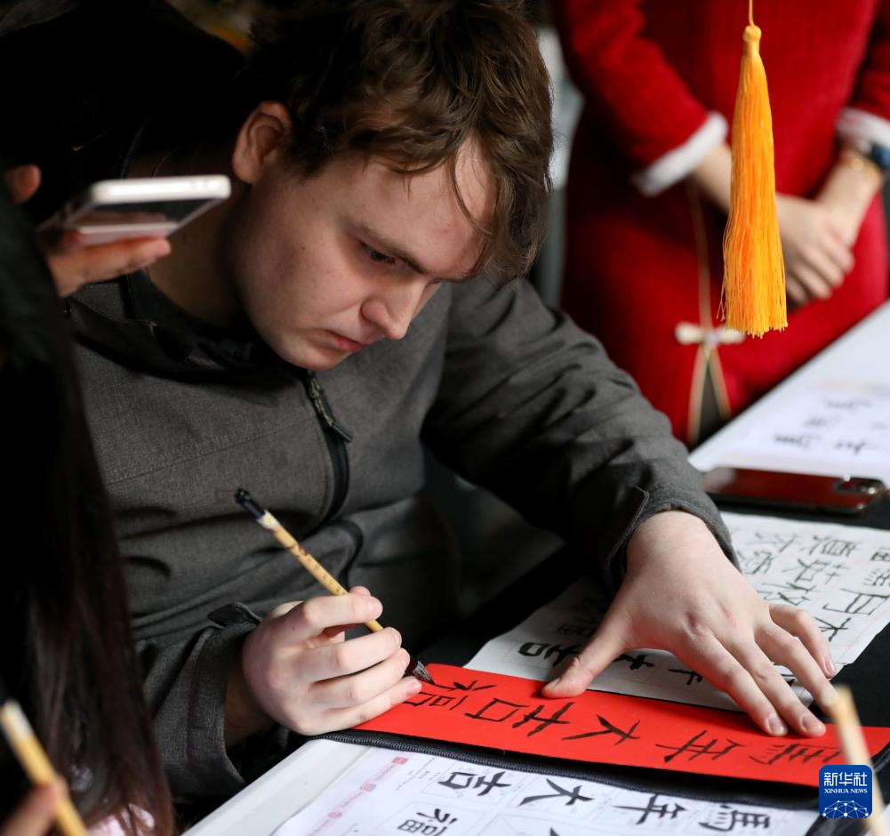 2月21日,一名男子在英国伦敦卡姆登集市举行的中国春节庆典活动上体验中国书法。