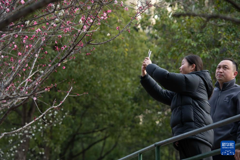 春节期间,安徽省合肥市匡河公园内梅花竞相绽放,吸引不少市民和游客前来观赏。