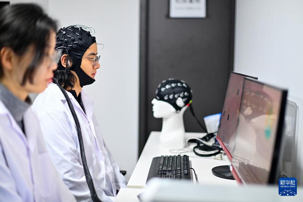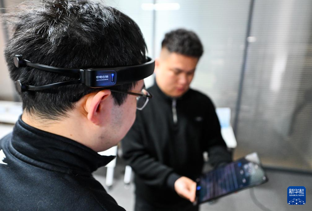 2月27日,在位于天津滨海高新区的中电云脑(天津)科技有限公司,一名佩戴“脑机智能头环”产品的工作人员在查看脑电波信号。