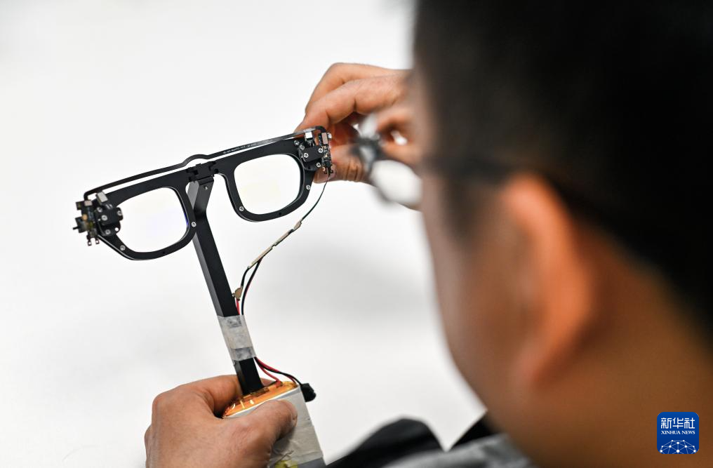 2月28日,在位于天津滨海高新区的尼卡光学(天津)有限公司,工作人员测试一款智能眼镜的原型机。