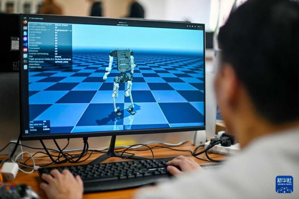 2月27日,在位于天津滨海高新区的天津木牛流马科技发展股份有限公司,工作人员对一款具身机器人进行仿真测试。