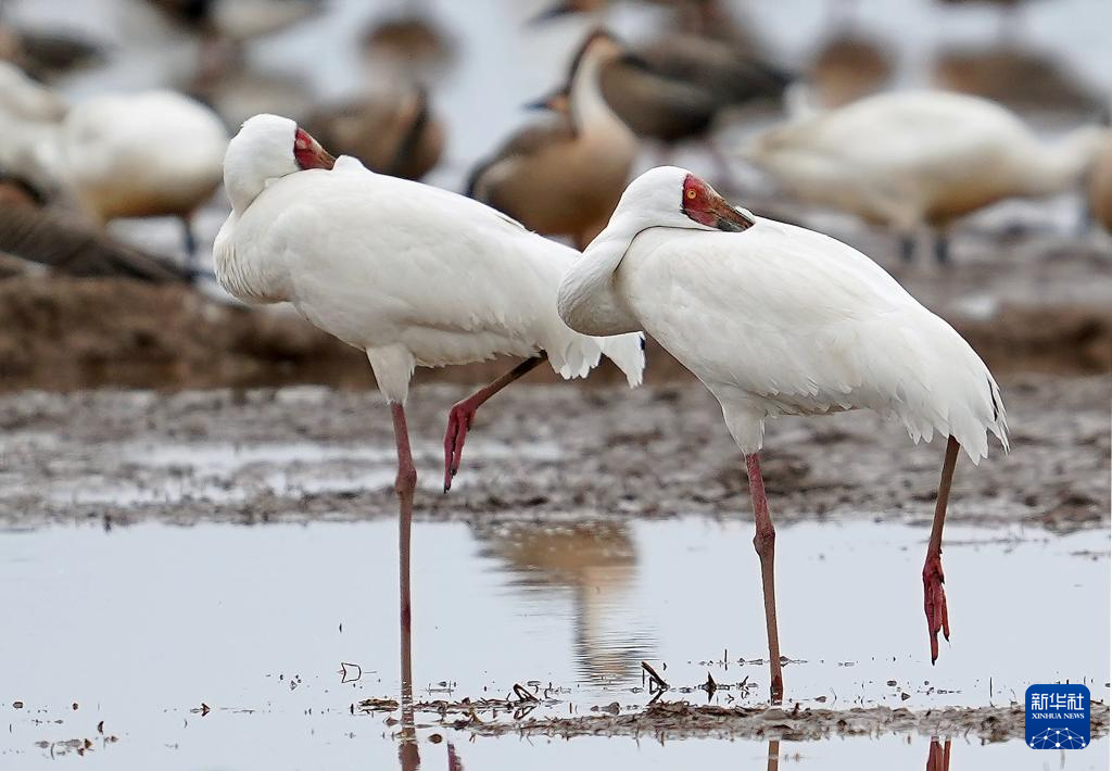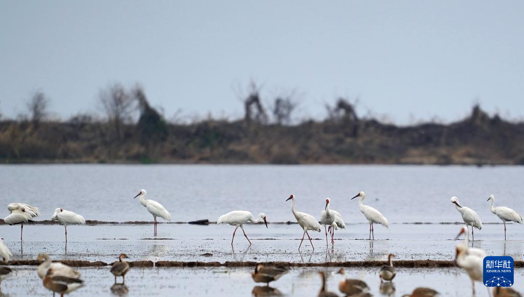 初春时节,上千只白鹤齐聚鄱阳湖畔的江西省上饶市余干县白鹤洲栖息觅食。它们时而凌空飞舞,时而滩涂嬉戏,构成一幅生机盎然的生态画卷。