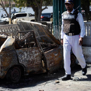 3月1日,在巴基斯坦南部城市卡拉奇的美国驻卡拉奇领事馆附近,一名警察经过被烧毁的车辆。