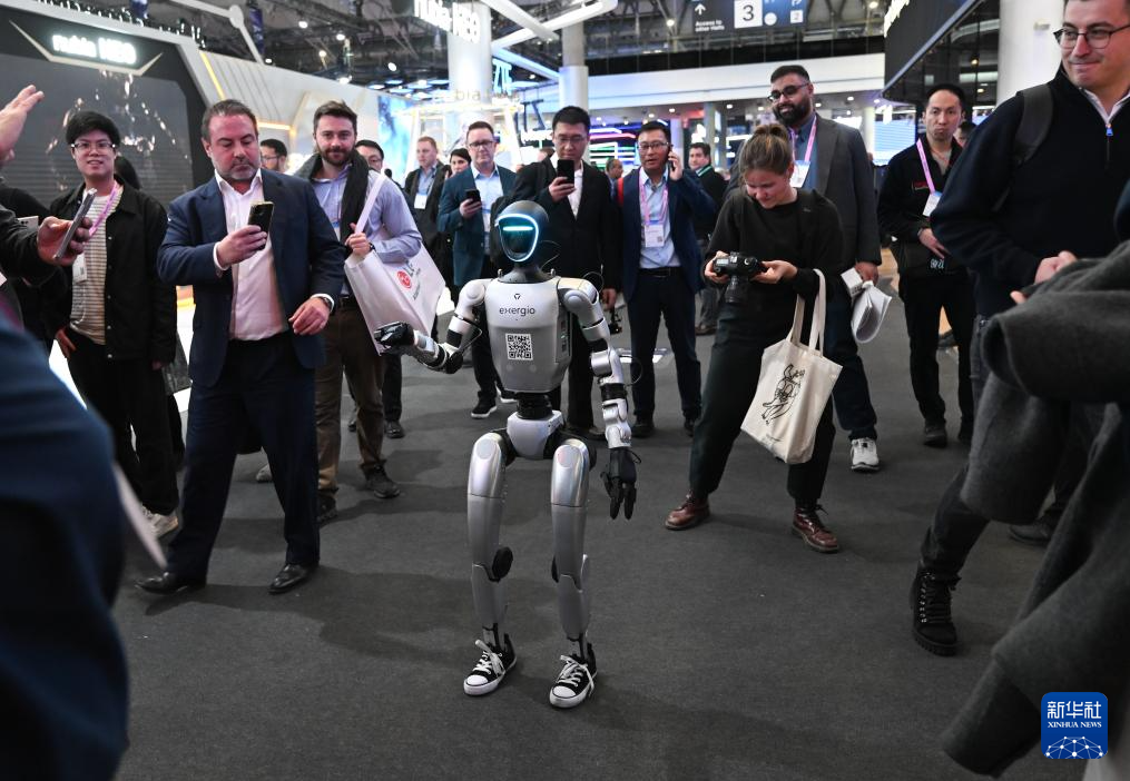 3月2日,在西班牙巴塞罗那,人们围观在展厅行走的人形机器人。
