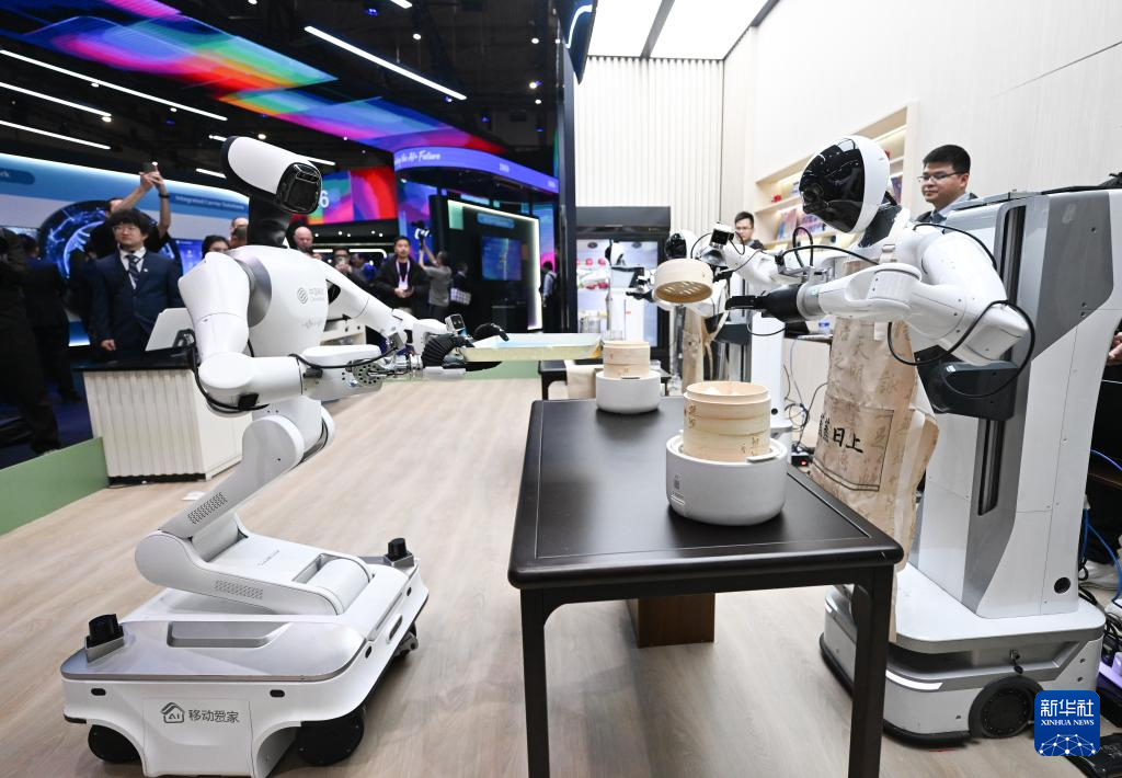 3月2日,在西班牙巴塞罗那,人们在中国移动展台参观厨房机器人。