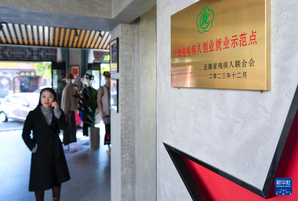 这是2月10日在金瑞瑞工作室内拍摄的“云南省残疾人创业就业示范点”牌匾。