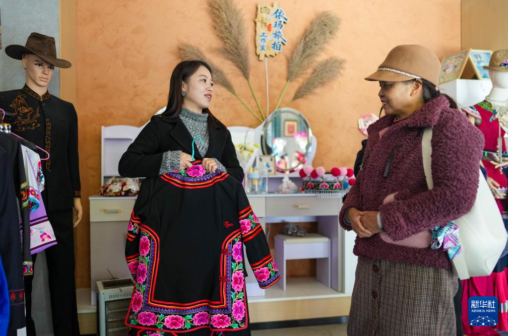 2月10日,金瑞瑞在自己的工作室内为顾客介绍彝绣服饰。