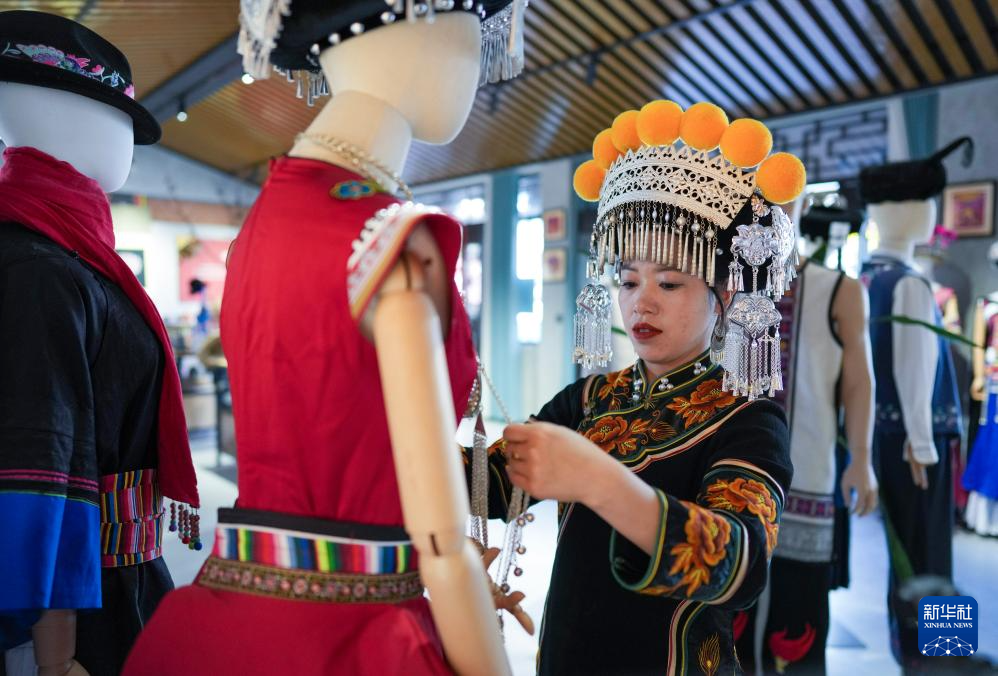 2月9日,金瑞瑞在自己的工作室内打理展出的彝绣服饰。