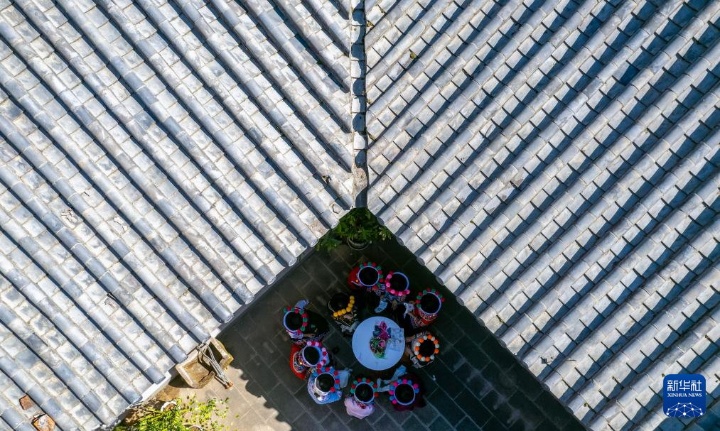 2月9日,金瑞瑞召集绣娘在自己的工作室内了解她们对彝绣产业发展的建议(无人机照片)。