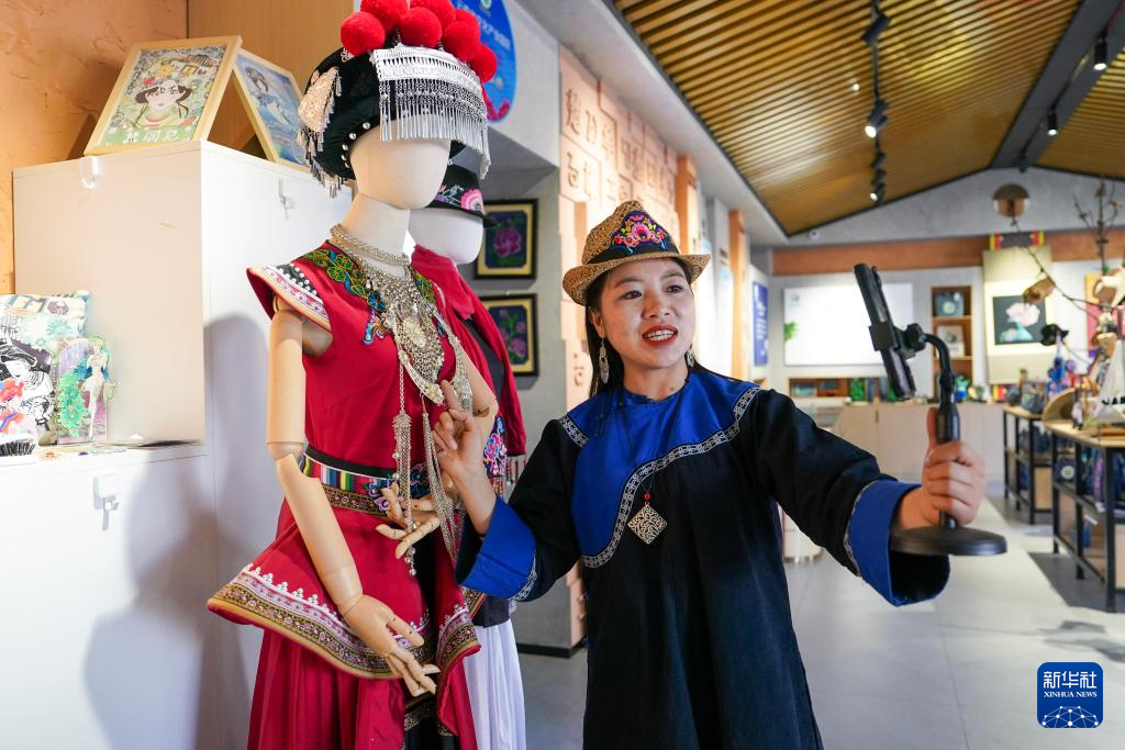 2月9日,金瑞瑞在自己的工作室内直播介绍彝绣服饰。