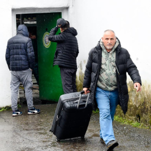 3月1日,在阿塞拜疆南部,一名从伊朗撤离的男子拖着行李走出阿斯塔拉口岸的铁门。
