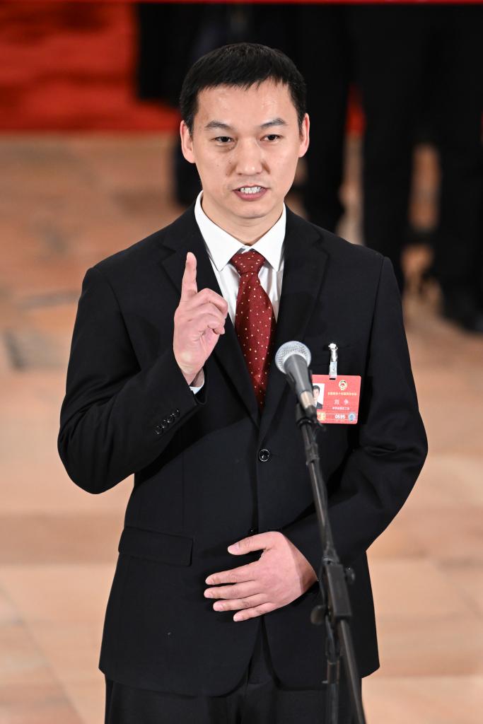 3月7日,全国政协十四届四次会议第二场“委员通道”集体采访活动在北京人民大会堂举行。这是全国政协委员刘争接受媒体采访。