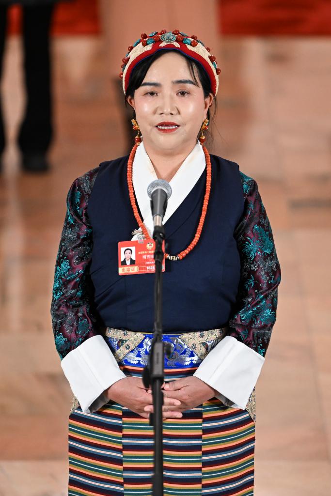 3月7日,全国政协十四届四次会议第二场“委员通道”集体采访活动在北京人民大会堂举行。这是全国政协委员明吉措姆接受媒体采访。