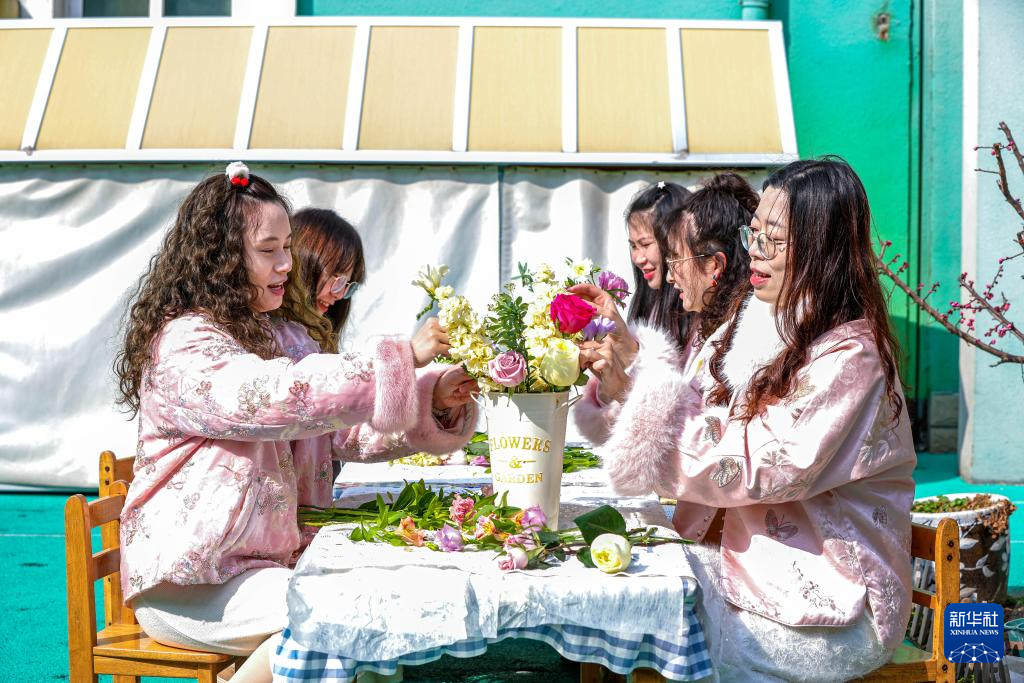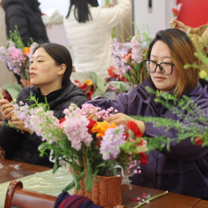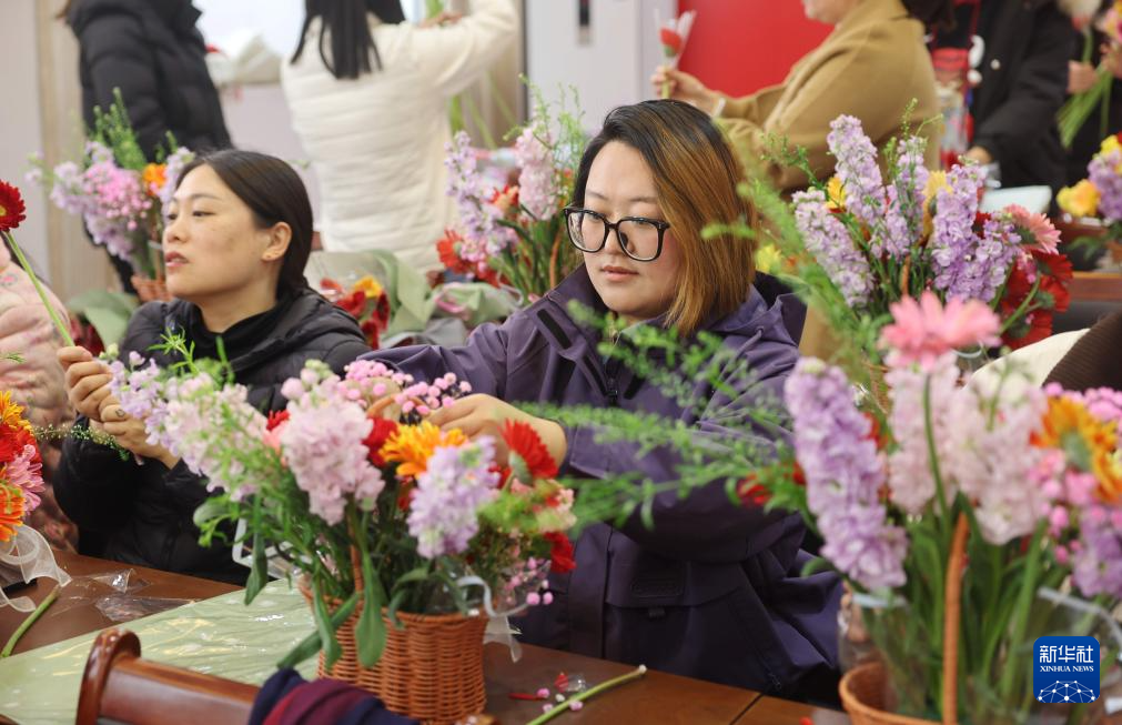 3月8日,在山东省临沂市沂南县张庄镇新时代文明实践活动中心,妇女参加插花艺术比赛。