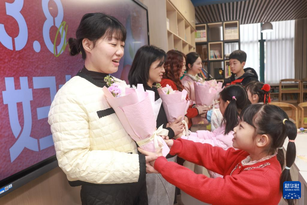 3月8日,在武汉市洪山区未来实验小学美林校区,小学生为妈妈送上节日鲜花。