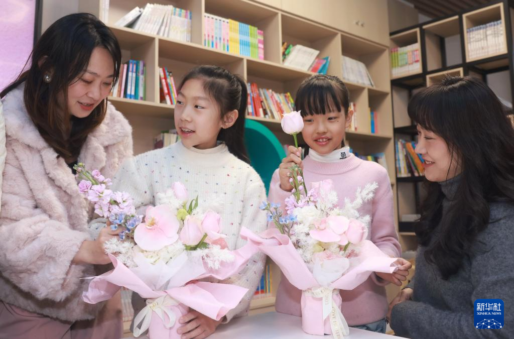3月8日,在武汉市洪山区未来实验小学美林校区,小学生和妈妈一起学习插花。