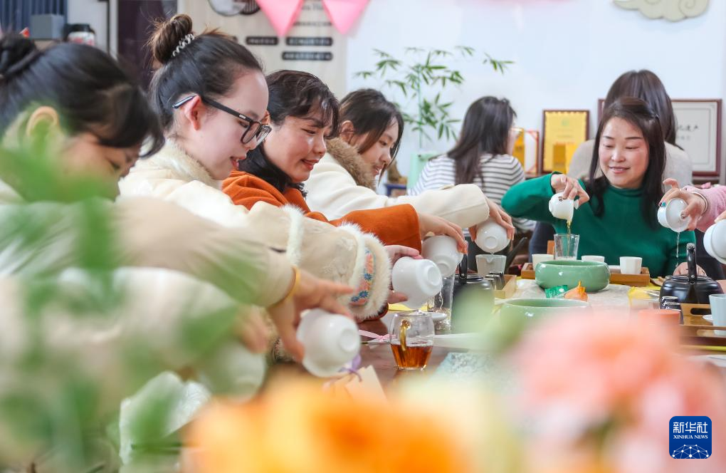 3月8日,江苏省句容市弘景小学女职工在庆“三八”活动中学习茶艺。