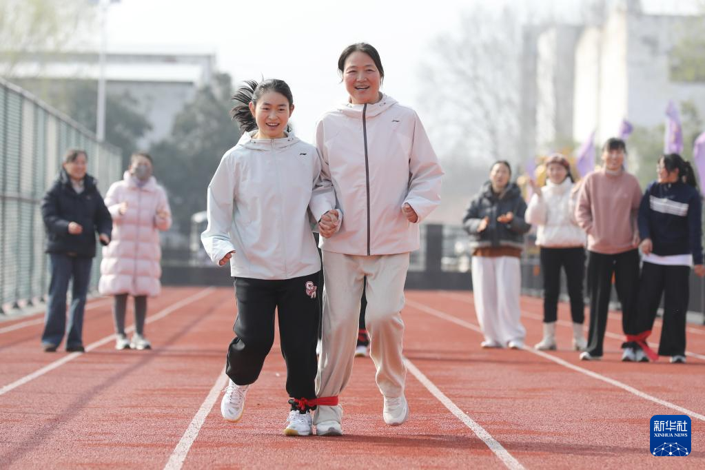 3月8日,在河南省焦作市温县全民健身活动中心,女职工参加“两人三足跑”趣味比赛。