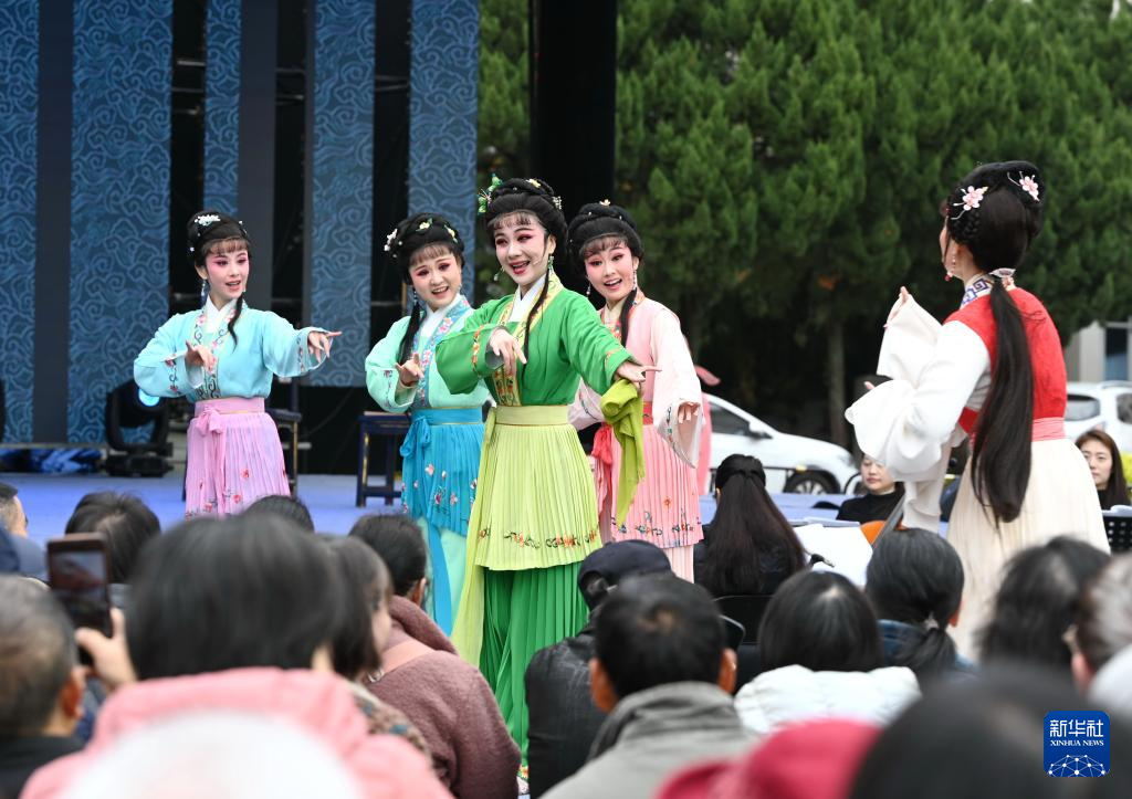 3月8日,在福建省福州市西湖公园则徐广场举行的“周末戏相逢”“三八”国际妇女节专场演出中,福建芳华越剧院演员在表演越剧。