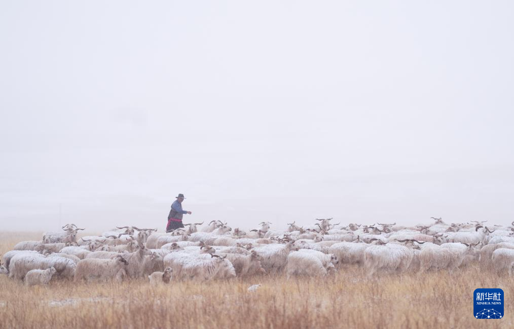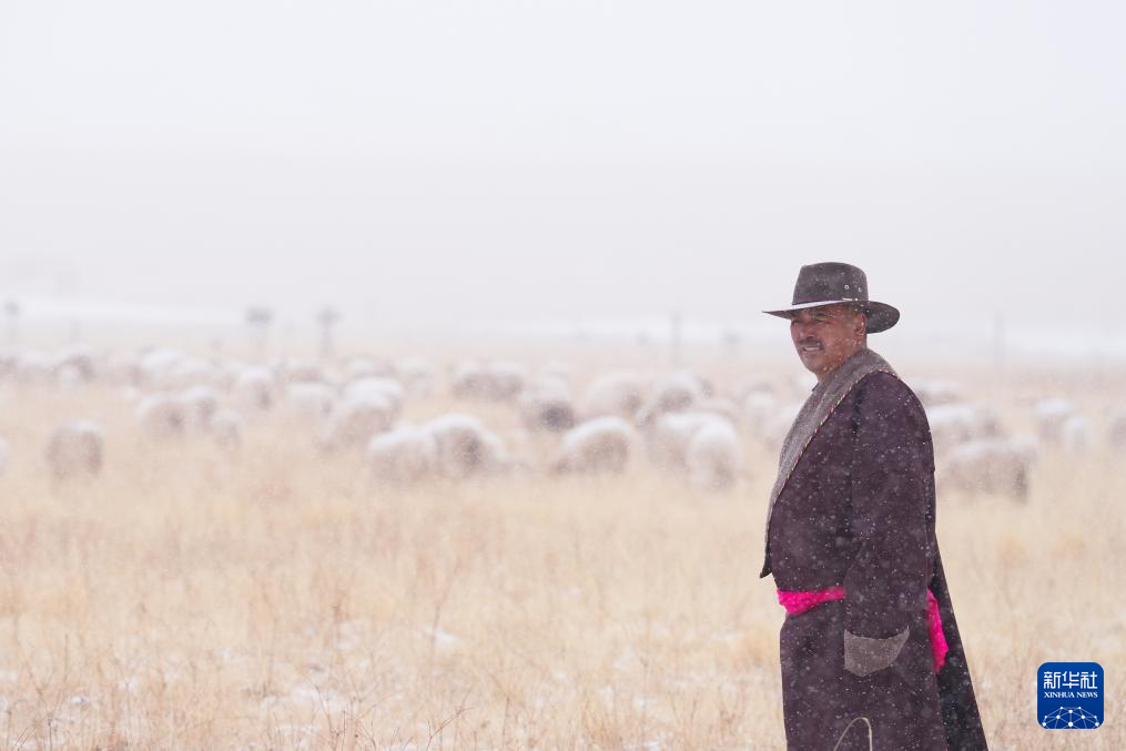 3月8日,在青海省海北藏族自治州祁连县,牧人在雪中放牧。