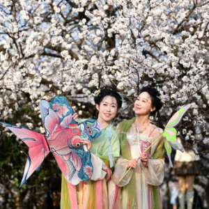 3月9日,游人在西安大明宫国家遗址公园赏花留影。