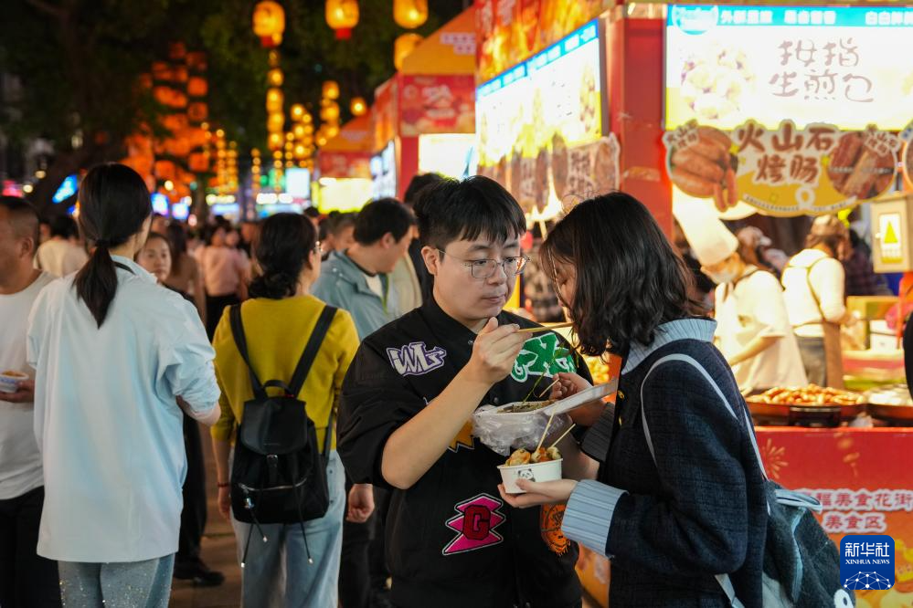 3月12日,在广州市越秀区北京路步行街区举办的美食庙会上,市民、游客在品尝美食。