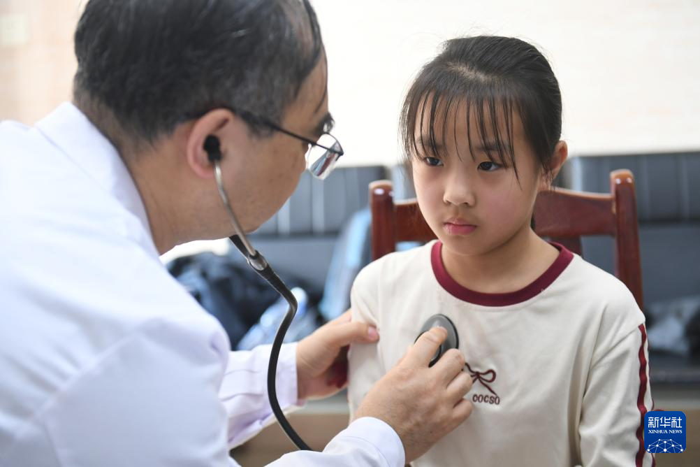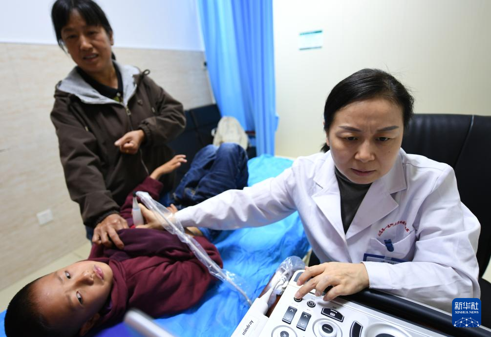 4月18日,在岳阳县人民医院,来自山东第一医科大学附属中心医院的医疗专家为孩子做检查。