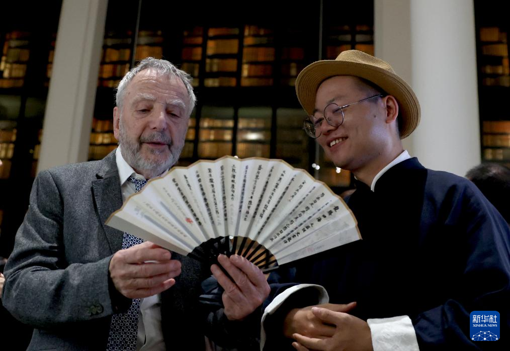4月24日,在英国伦敦举行的“城市茶客厅”暨“魅力上海”城市形象推广活动上,一名男子欣赏传统中国折扇。