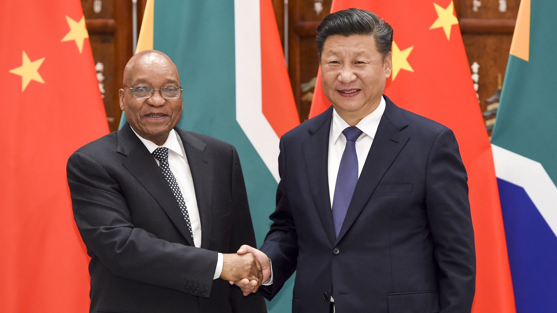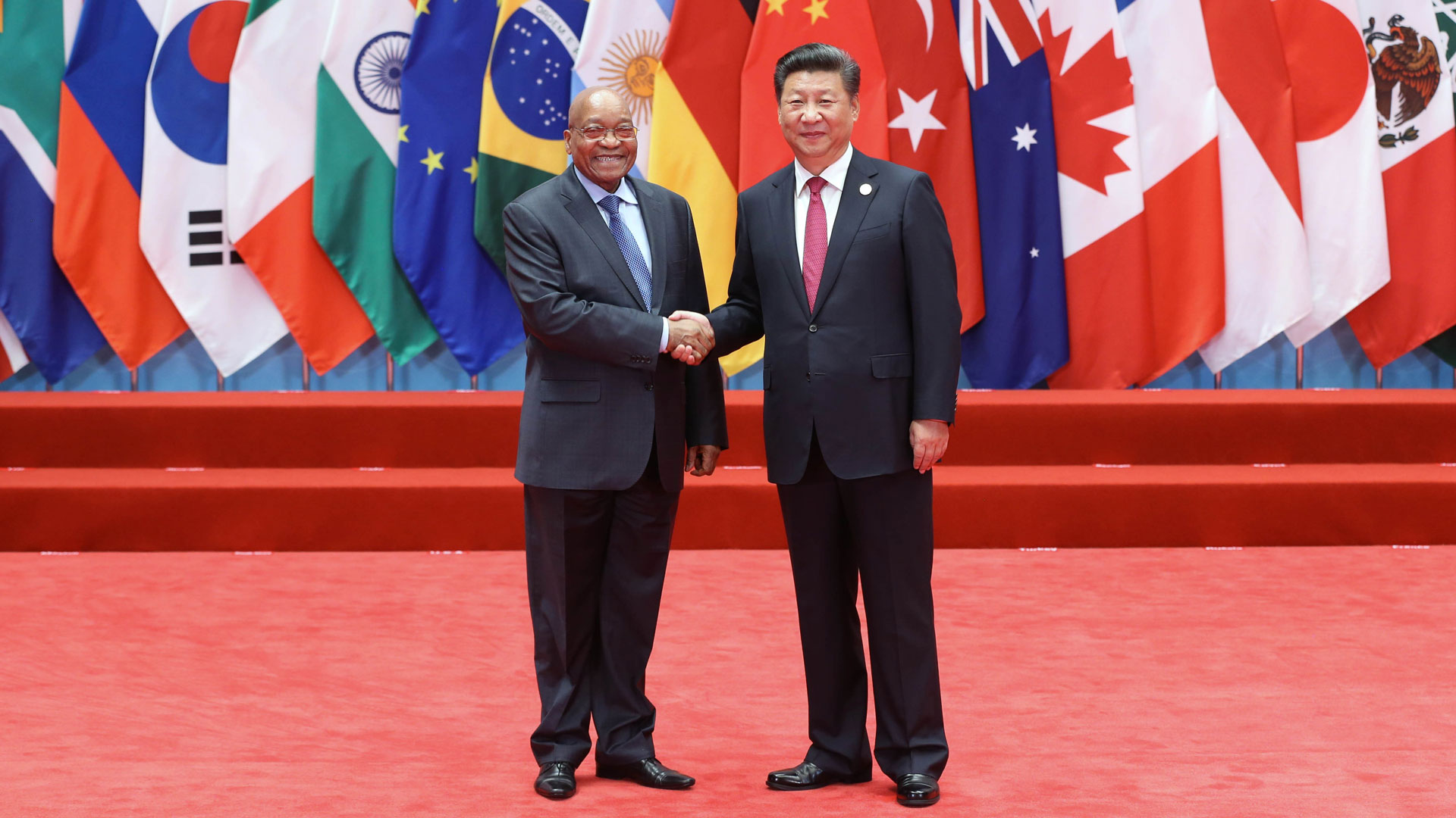 9月4日,二十国集团领导人第十一次峰会在杭州举行,中国国家主席习近平在国际博览中心迎接各成员和嘉宾国领导人、有关国际组织负责人。这是习近平与南非总统祖马握手。 新华社记者马占成摄