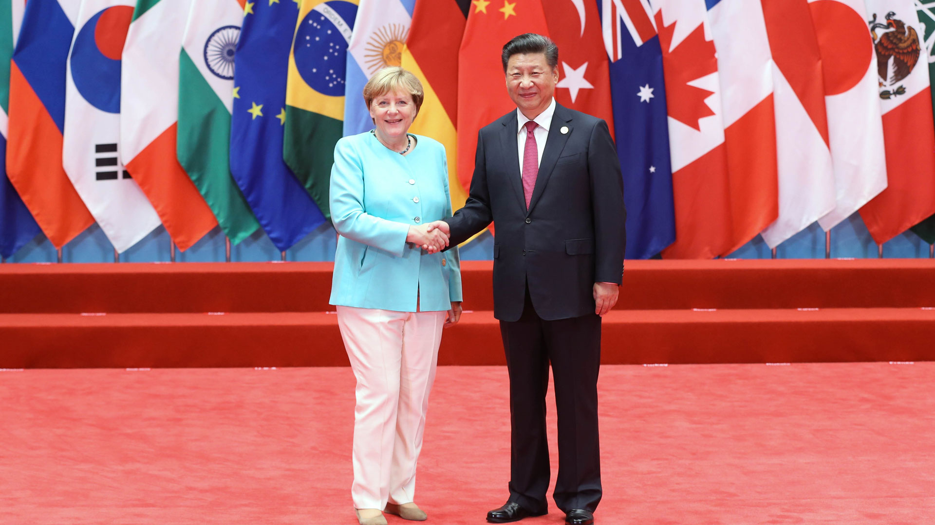 9月4日,二十国集团领导人第十一次峰会在杭州举行,中国国家主席习近平在国际博览中心迎接各成员和嘉宾国领导人、有关国际组织负责人。这是习近平与德国总理默克尔握手。 新华社记者马占成摄