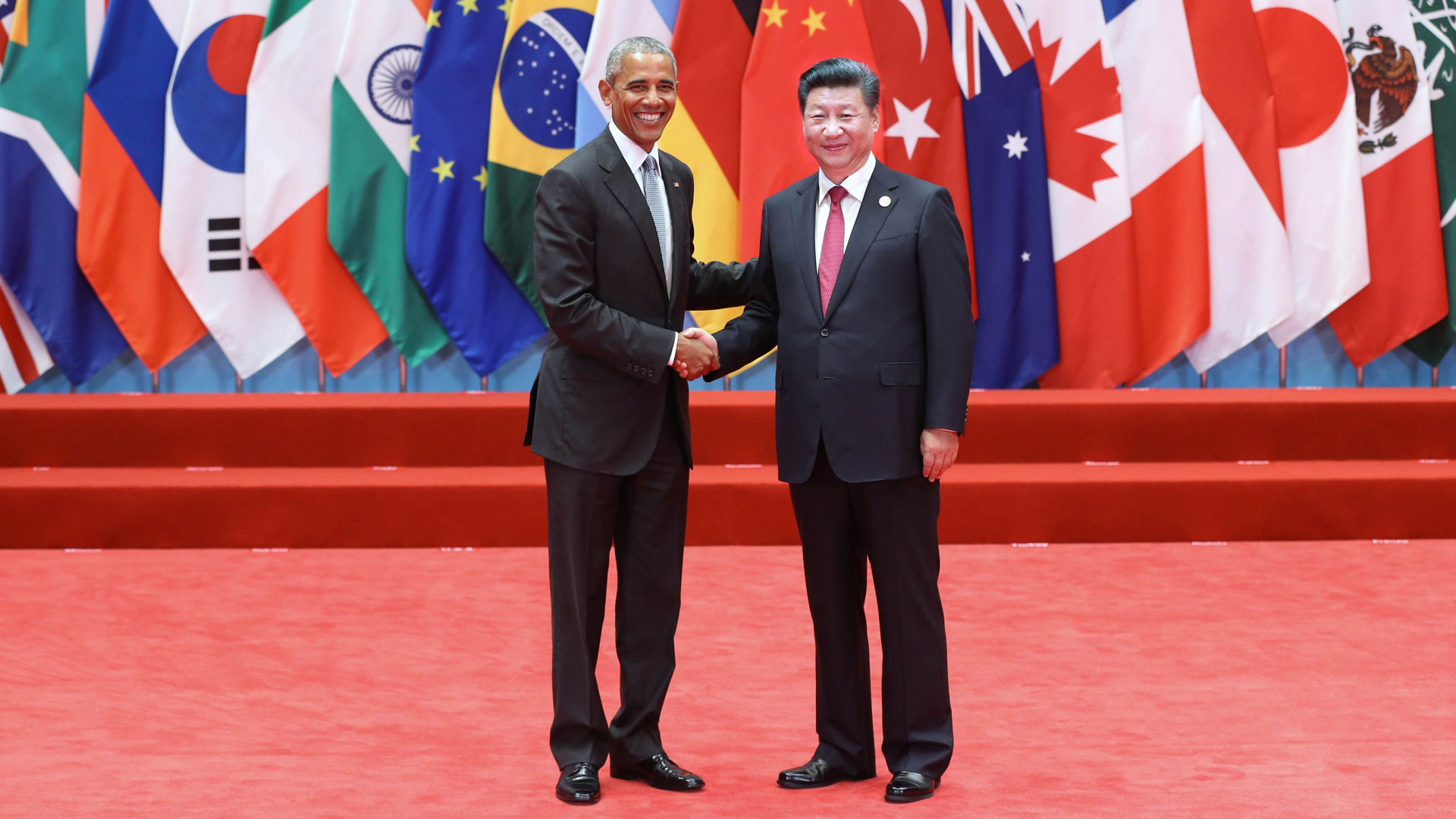 9月4日,二十国集团领导人第十一次峰会在杭州举行,中国国家主席习近平在国际博览中心迎接各成员和嘉宾国领导人、有关国际组织负责人。这是习近平与美国总统奥巴马握手。 新华社记者马占成摄