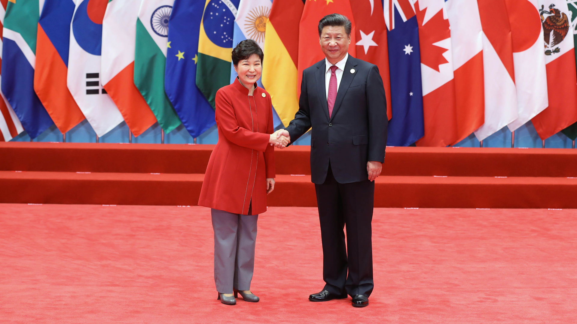 9月4日,二十国集团领导人第十一次峰会在杭州举行,中国国家主席习近平在国际博览中心迎接各成员和嘉宾国领导人、有关国际组织负责人。这是习近平与韩国总统朴槿惠握手。 新华社记者马占成摄