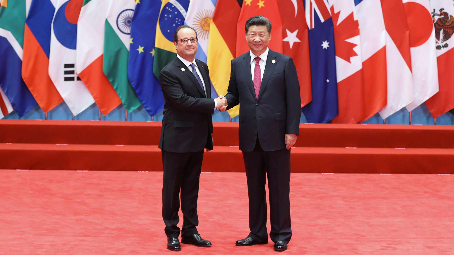 9月4日,二十国集团领导人第十一次峰会在杭州举行,中国国家主席习近平在国际博览中心迎接各成员和嘉宾国领导人、有关国际组织负责人。这是习近平与法国总统奥朗德握手。 新华社记者马占成摄