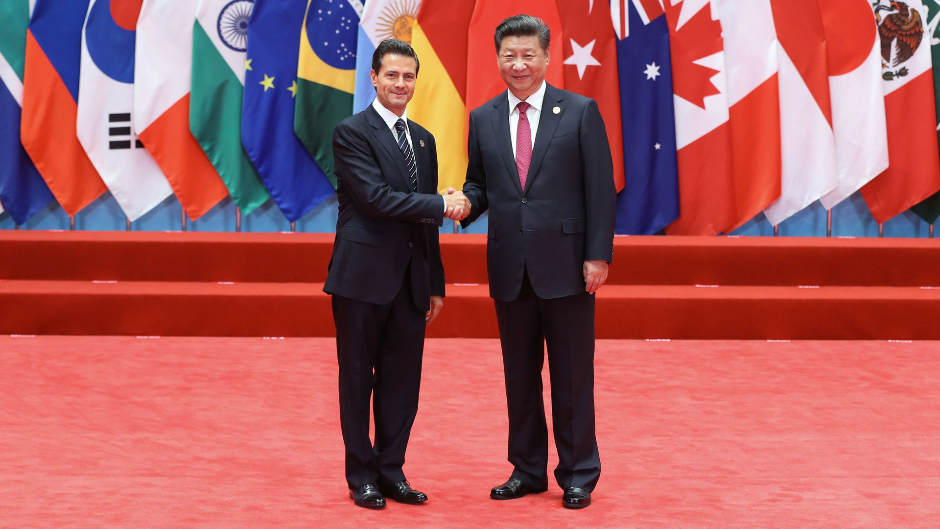 9月4日,二十国集团领导人第十一次峰会在杭州举行,中国国家主席习近平在国际博览中心迎接各成员和嘉宾国领导人、有关国际组织负责人。这是习近平与墨西哥总统培尼亚握手。 新华社记者马占成摄