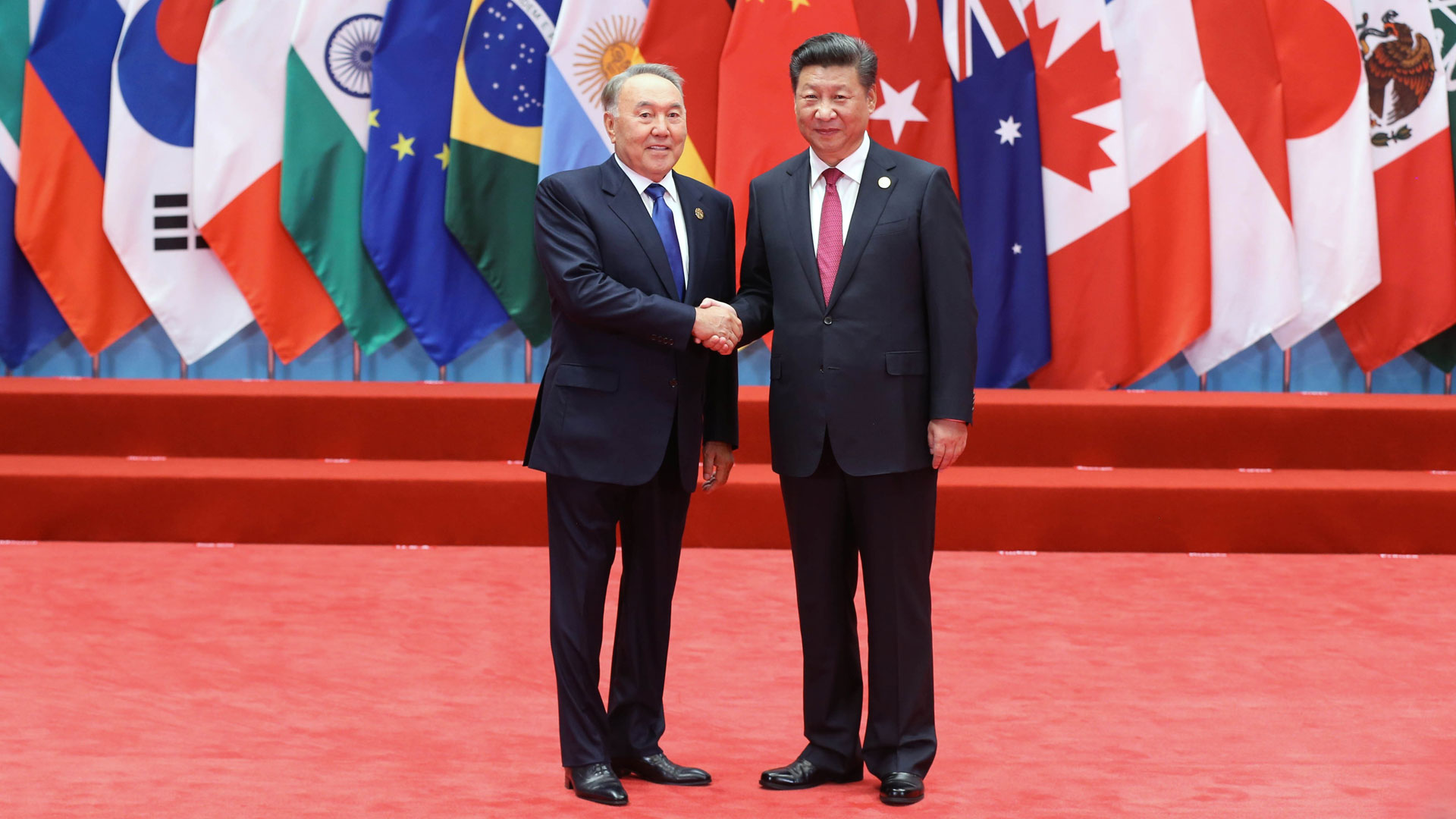9月4日,二十国集团领导人第十一次峰会在杭州举行,中国国家主席习近平在国际博览中心迎接各成员和嘉宾国领导人、有关国际组织负责人。这是习近平与哈萨克斯坦总统纳扎尔巴耶夫握手。 新华社记者马占成摄