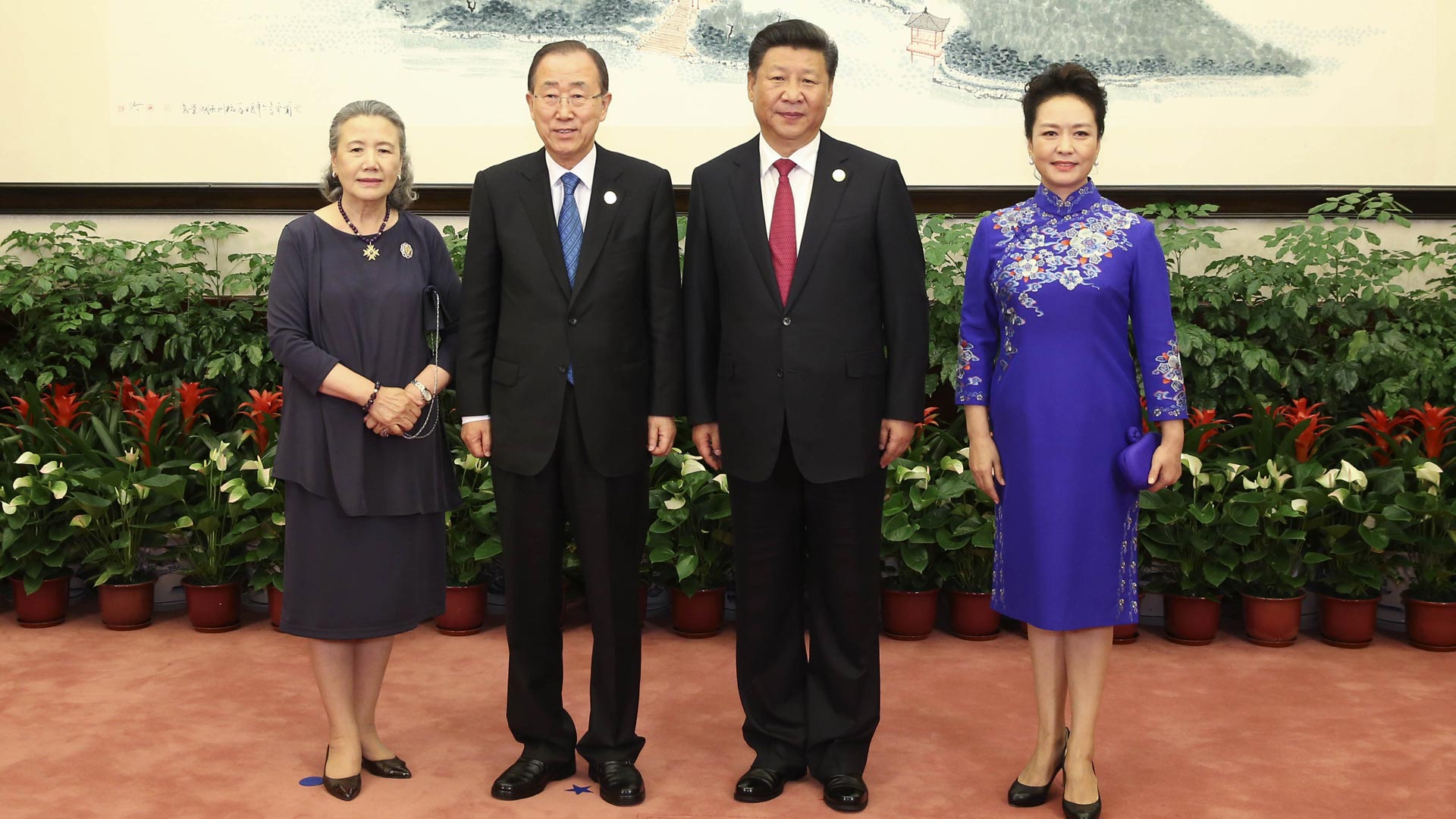 9月4日,国家主席习近平和夫人彭丽媛在杭州西子宾馆举行宴会,欢迎出席二十国集团领导人杭州峰会的外方代表团团长及所有嘉宾。这是习近平和彭丽媛迎候联合国秘书长潘基文夫妇。新华社记者庞兴雷摄