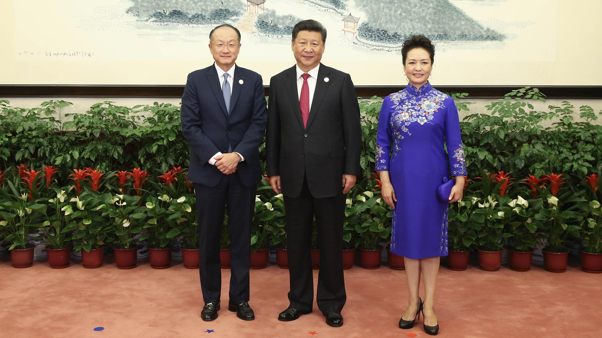 9月4日,国家主席习近平和夫人彭丽媛在杭州西子宾馆举行宴会,欢迎出席二十国集团领导人杭州峰会的外方代表团团长及所有嘉宾。这是习近平和彭丽媛迎候世界银行行长金墉。新华社记者庞兴雷摄